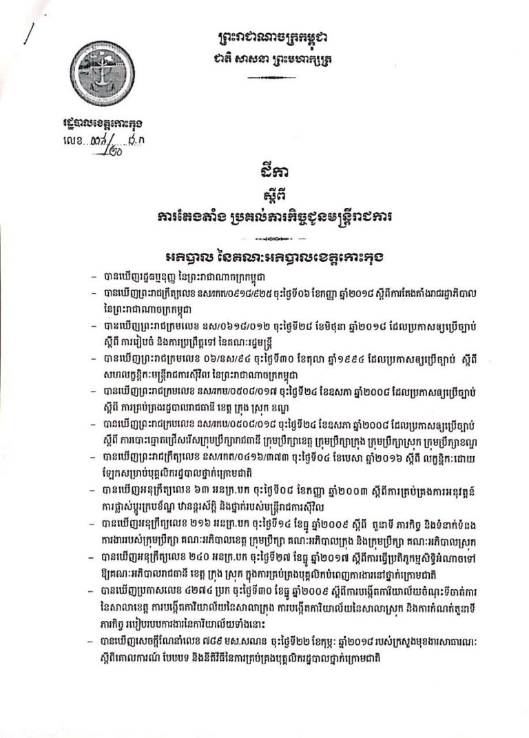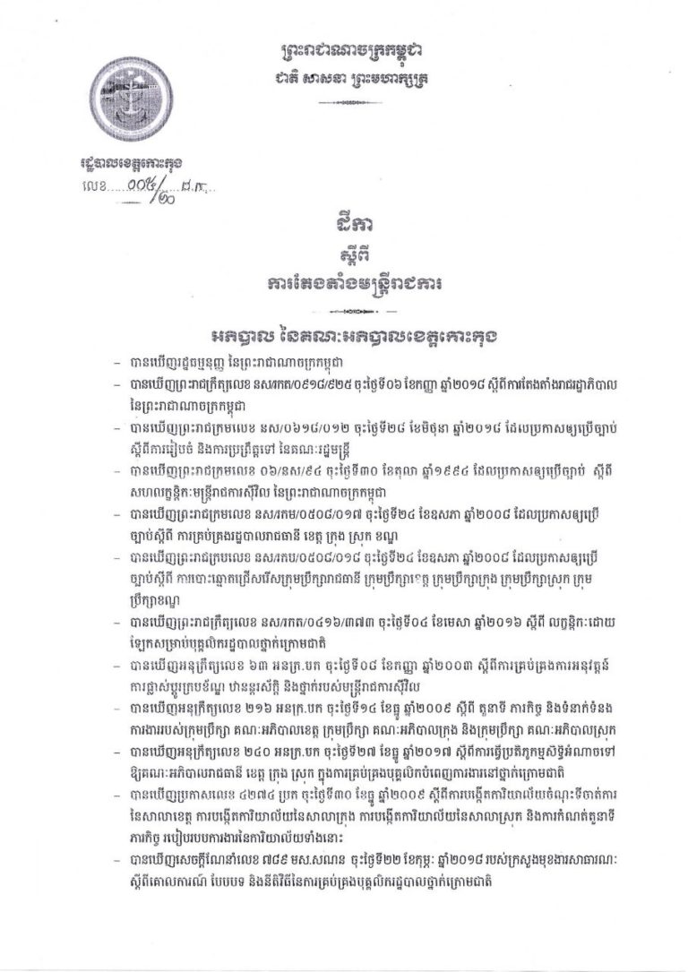 ដីកាស្តីពីការតែងតាំងមន្ត្រីរាជការ នៃរដ្ឋបាលខេត្តកោះកុង