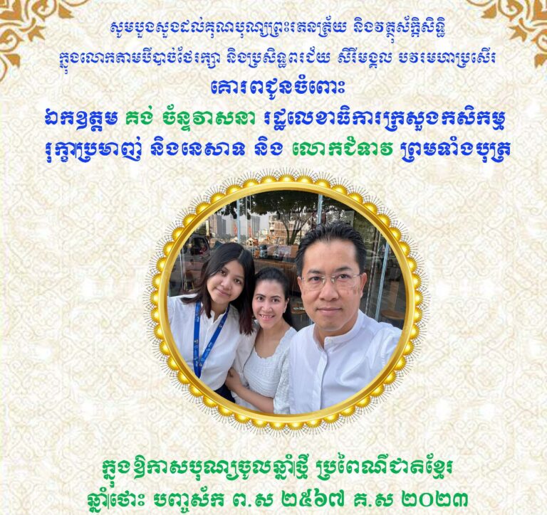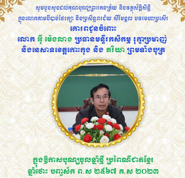 ថ្នាក់ដឹកនាំមន្ទីរ និងមន្ត្រីក្រោមឱាវាទមន្ទីរកសិកម្ម រុក្ខាប្រមាញ់ និងនេសាទខេត្តកោះកុងទាំងអស់ សូមគោរពជូនពរ លោក អុី ម៉េងលាង ប្រធានមន្ទីរកសិកម្ម រុក្ខាប្រមាញ់ និងនេសាទខេត្តកោះកុង និងភរិយា ព្រមទាំងបុត្រាបុត្រី ក្នុងឱកាសពិធីបុណ្យចូលឆ្នំាថ្មី ប្រពៃណីជាតិខ្មែរ ឆ្នាំថោះ បញ្ចស័ក ព.ស.២៤៦៧ គ.ស.២០២៣