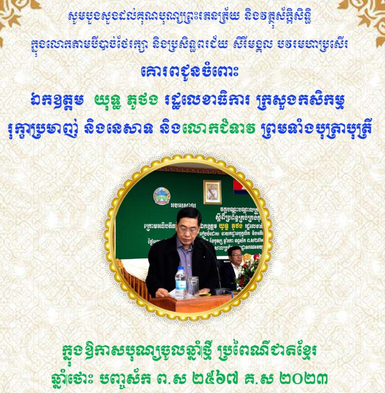 ថ្នាក់ដឹកនាំមន្ទីរ និងមន្ត្រីក្រោមឱាវាទមន្ទីរកសិកម្ម រុក្ខាប្រមាញ់ និងនេសាទខេត្តកោះកុងទាំងអស់ សូមគោរពជូនពរ ឯកឧត្តម យុទ្ធ ភូថង រដ្ឋលេខាធិការក្រសួងកសិកម្ម រុក្ខាប្រមាញ់ និងនេសាទ និងលោកជំទាវ ព្រមទាំងបុត្រាបុត្រី ក្នុងឱកាសពិធីបុណ្យចូលឆ្នំាថ្មី ប្រពៃណីជាតិខ្មែរ ឆ្នាំថោះ បញ្ចស័ក ព.ស.២៤៦៧ គ.ស.២០២៣
