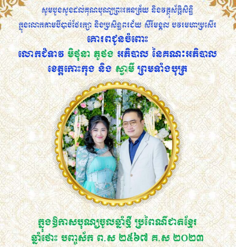 ថ្នាក់ដឹកនាំមន្ទីរ និងមន្ត្រីក្រោមឱាវាទមន្ទីរកសិកម្ម រុក្ខាប្រមាញ់ និងនេសាទខេត្តកោះកុងទាំងអស់ សូមគោរពជូនពរ លោកជំទាវ មិថុនា ភូថង អភិបាល នៃគណៈអភិបាលខេត្តកោះកុង និងស្វាមី ព្រមទាំងបុត្រ ក្នុងឱកាសពិធីបុណ្យចូលឆ្នំាថ្មី ប្រពៃណីជាតិខ្មែរ ឆ្នាំថោះ បញ្ចស័ក ព.ស.២៤៦៧ គ.ស.២០២៣