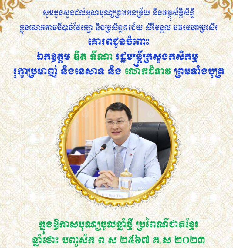 ថ្នាក់ដឹកនាំមន្ទីរ និងមន្ត្រីក្រោមឱាវាទមន្ទីរកសិកម្ម រុក្ខាប្រមាញ់ និងនេសាទខេត្តកោះកុងទាំងអស់ សូមគោរពជូនពរ ឯកឧត្តម ឌិត ទីណា រដ្ឋមន្ត្រីក្រសួងកសិកម្ម រុក្ខាប្រមាញ់ និងនេសាទ និងលោកជំទាវ ព្រមទាំងក្រុមគ្រួសារ ក្នុងឱកាសពិធីបុណ្យចូលឆ្នំាថ្មី ប្រពៃណីជាតិខ្មែរ ឆ្នាំថោះ បញ្ចស័ក ព.ស.២៤៦៧ គ.ស.២០២៣