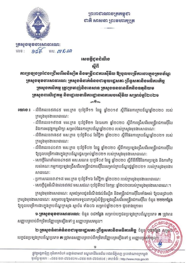 មន្ទីរកសិកម្ម រុក្ខាប្រមាញ់ និងនេសាទខេត្តកោះកុង៖ សេចក្តីជូនដំណឹង ស្តីពីការប្រឡងប្រជែងជ្រើសរើសនិស្សិត និងមន្ត្រីរាជការស៊ីវិលឱ្យចូលបម្រើការងារក្នុងក្របខ័ណ្ឌក្រសួងកសិកម្ម រុក្ខាប្រមាញ់ នេសាទ និងក្រសួង ស្ថាប័នរដ្ឋ សម្រាប់ឆ្នាំ២០២១
