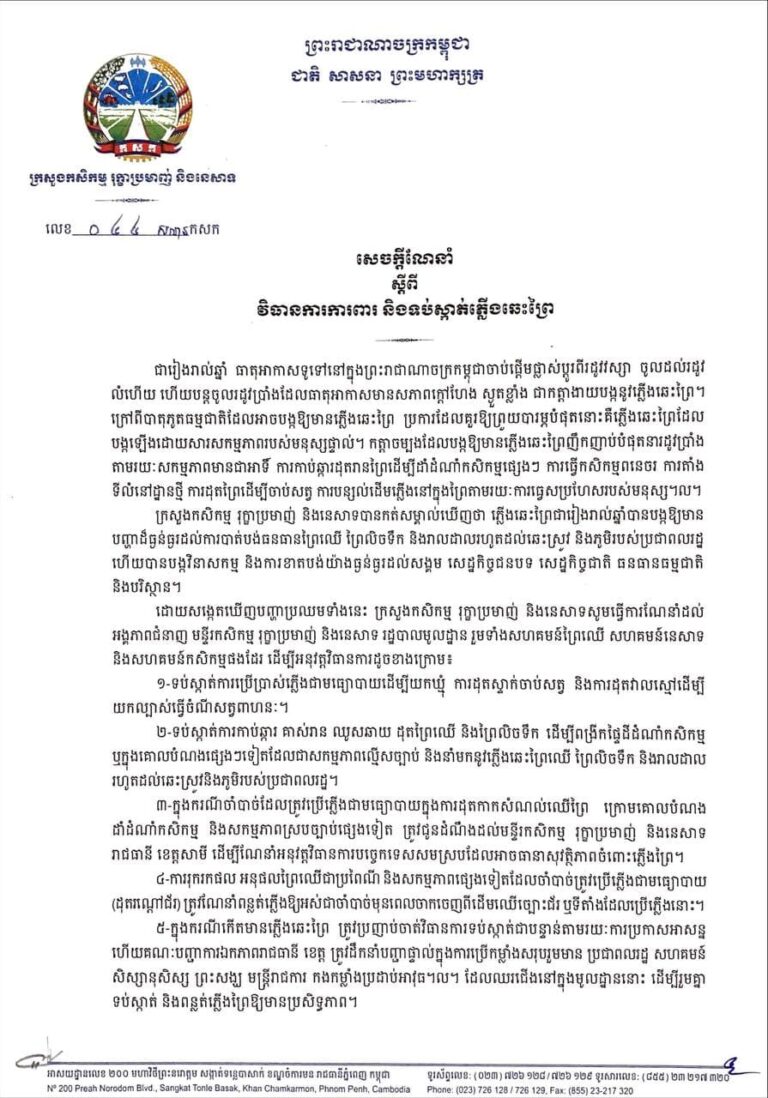 មន្ទីរកសិកម្ម រុក្ខាប្រមាញ់ និងនេសាទខេត្តកោះកុង៖ សេចក្តីណែនាំ ស្តីពីវិធានការការពារ និងទប់ស្កាត់ភ្លើងឆេះព្រៃ