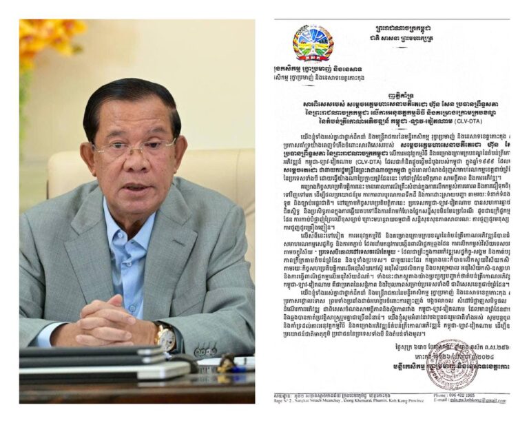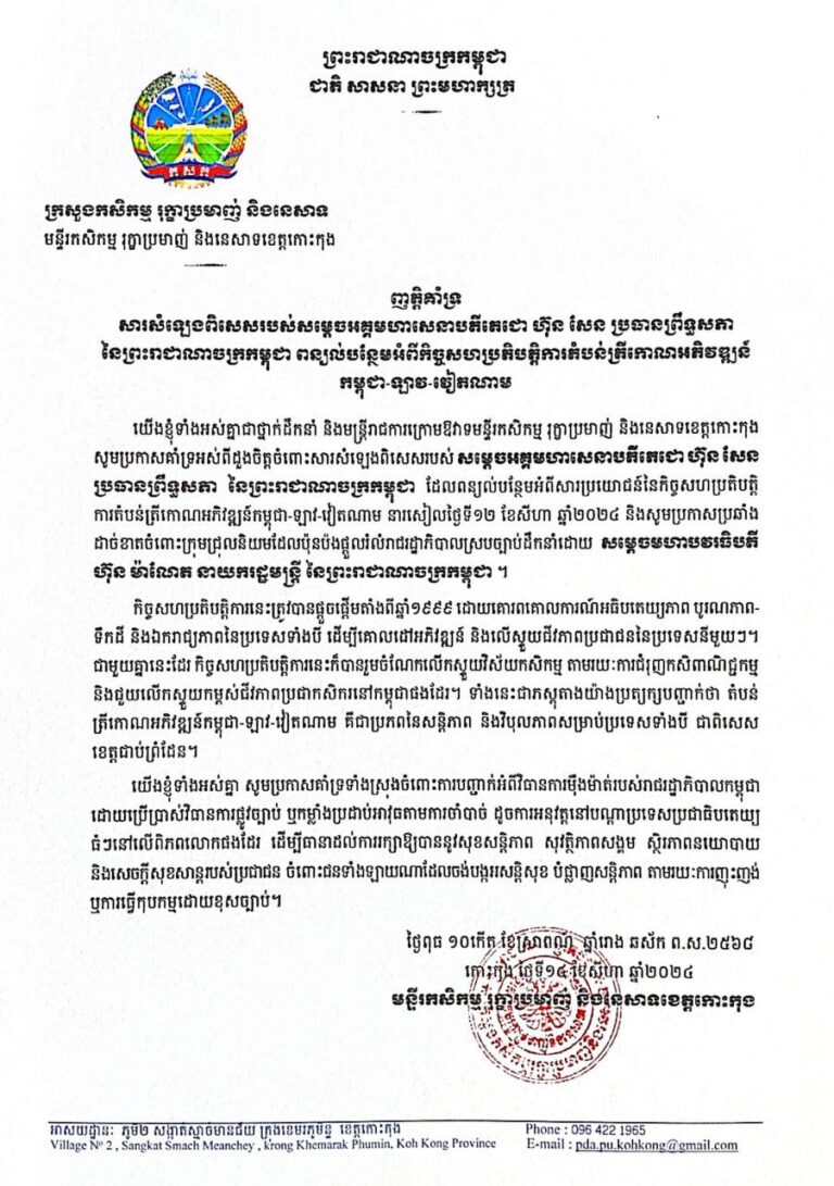 យើងខ្ញុំទាំងអស់គ្នាជាថ្នាក់ដឹកនាំ និងមន្ត្រីរាជការក្រោមឱវាទមន្ទីរកសិកម្ម រុក្ខាប្រមាញ់ និងនេសាទខេត្តកោះកុង សូមប្រកាសគាំទ្រអស់ពីដួងចិត្តចំពោះសារសំឡេងពិសេសរបស់ សម្តេចអគ្គមហាសេនាបតីតេជោ ហ៊ុន សែន ប្រធានព្រឹទ្ធសភា នៃព្រះរាជាណាចក្រកម្ពុជា ដែលពន្យល់បន្ថែមអំពីសារប្រយោជន៍នៃកិច្ចសហប្រតិបត្តិការតំបន់ត្រីកោណអភិវឌ្ឍន៍កម្ពុជា-ឡាវ-វៀតណាម នារសៀលថ្ងៃទី១២ ខែសីហា ឆ្នាំ២០២៤