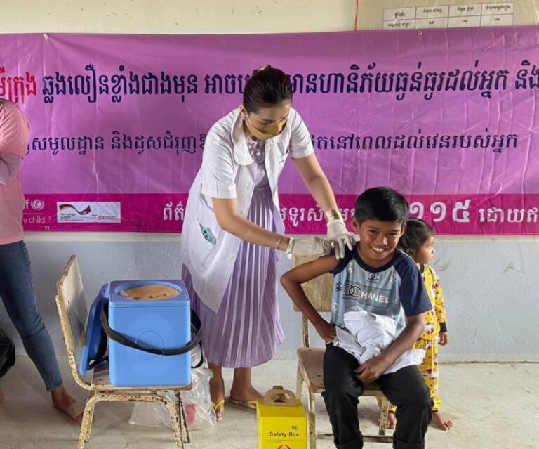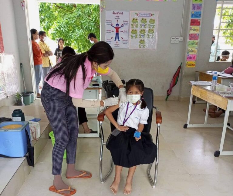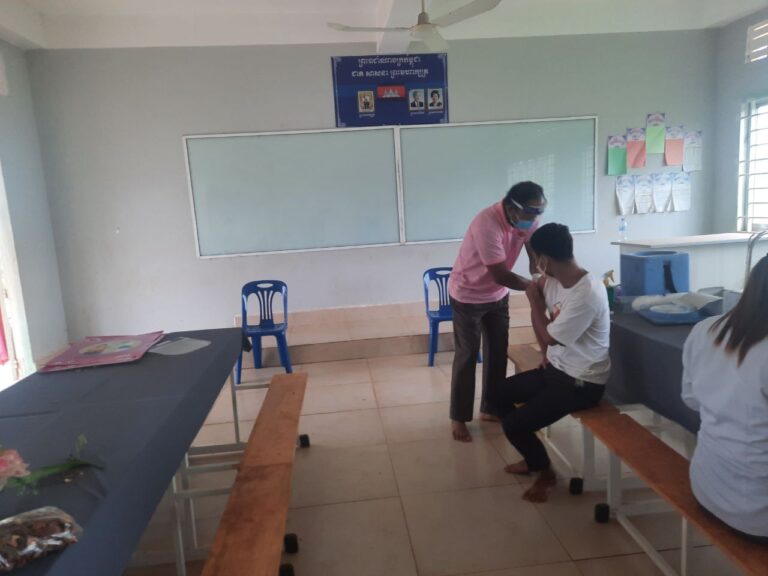 មន្ត្រីសុខាភិបាលនៃមណ្ឌលសុខភាពនាងកុក ចុះចាក់វ៉ាក់សាំងកូវីដ-១៩ នៅសាលាបឋមសិក្សា ហ៊ុន សែនចាំយាម