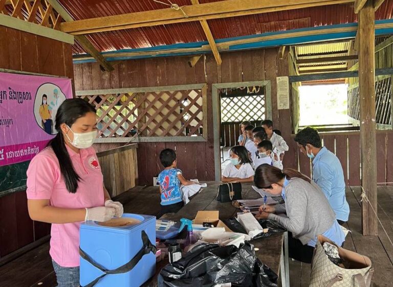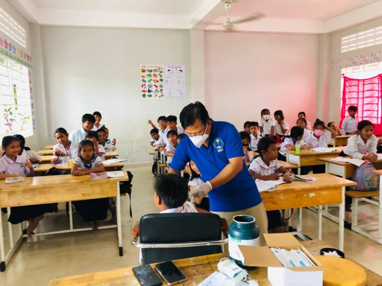 មន្ត្រីសុខាភិបាលនៃមណ្ឌលសុខភាពភ្ញីមាស ចុះចាក់វ៉ាក់សាំងកូវីដ-១៩ នៅសាលាបឋមសិក្សាព្រែកស្មាច់