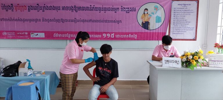 មន្ត្រីសុខាភិបាលនៃមណ្ឌលសុខភាពឬស្សីជ្រុំ ចុះចាក់វ៉ាក់សាំងកូវីដ-១៩ នៅសាលាបឋមសិក្សា និងវិទ្យាល័យឬស្សីជ្រុំ