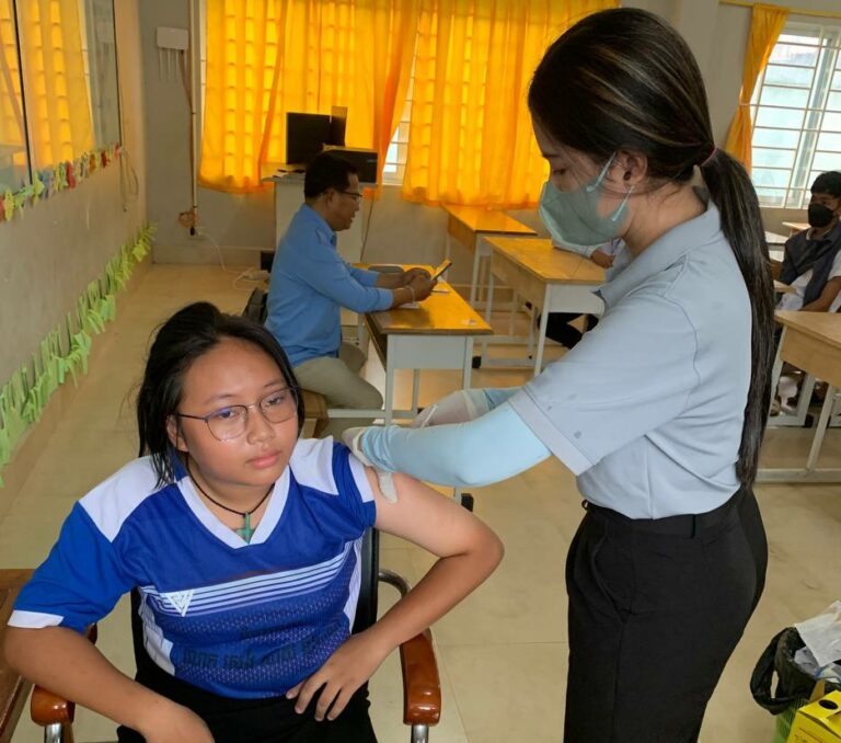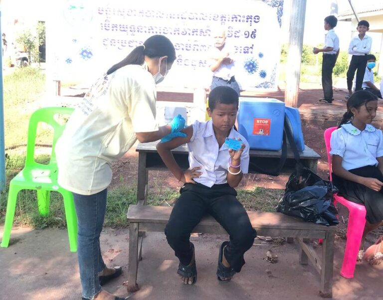 មន្ត្រីសុខាភិបាលនៃមណ្ឌលសុខភាពត្រពាំងរូង ចុះចាក់វ៉ាក់សាំងកូវីដ-១៩ នៅសាលាបឋមសិក្សារុងផ្លាមកេសន