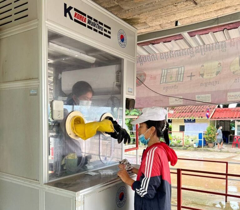 មន្ត្រីសុខាភិបាលនៃមណ្ឌលសុខភាពស្ទឹងវែង ចុះចាក់វ៉ាក់សាំងកូវីដ-១៩ នៅសាលាបឋមសិក្សារស្មីសាមគ្គី ខេត្តកោះកុងព្រែកស្វាយ