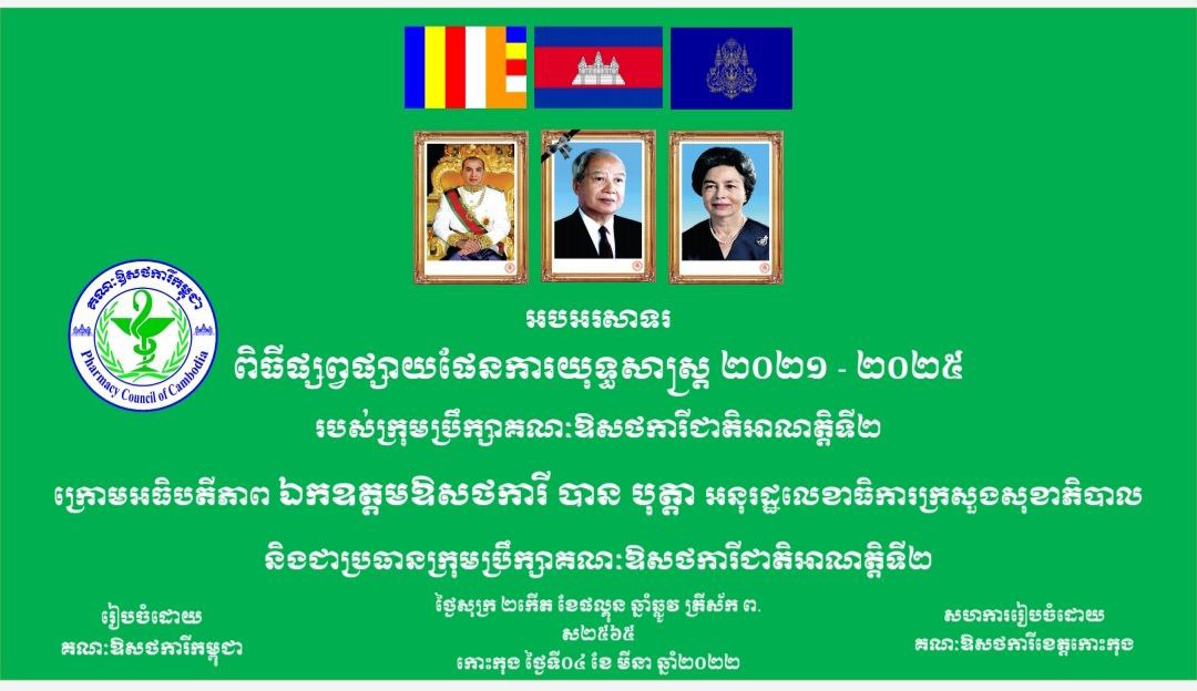 ពិធីផ្សព្វផ្សាយផែនការយុទ្ធសាស្រ្ត ២០២១-២០២៥ របស់ក្រុមប្រឹក្សាគណៈឱសថការីជាតិអាណត្តិទី២ក្រោមអធិបតីភាព ឯកឧត្ដមឱសថការី បាន បុត្តា អនុរដ្ឋលេខាធិការក្រសួងសុខាភិបាល និងជាប្រធានក្រុមប្រឹក្សាគណៈឱសថការីជាតិអាណត្តិទី២ថ្ងៃទី០៤ ខែមីនា ឆ្នាំ២០២២
