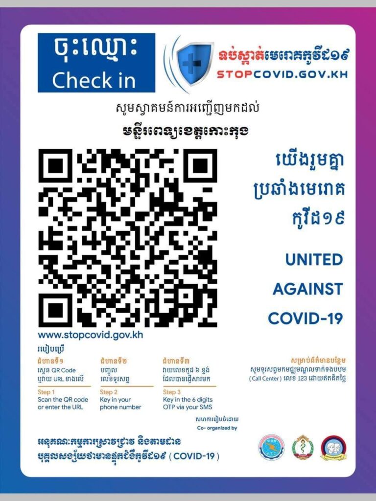 មន្ទីរពេទ្យខេត្តកោះកុងបានរៀបចំដាក់ប្រព័ន្ធ QR code នៅច្រកចូលខ្លោងទ្វារខាងមុខ (Primary Screening) នៅមុខបន្ទប់បែងចែកអ្នកជំងឺ(បន្ទប់លេខ១) និងនៅមុខបន្ទប់ពិគ្រោះជំងឺក្រៅ (បន្ទប់លេខ៦) ឲសាធារណជនដែលចូលមកមន្ទីរពេទ្យអាចស្កេនបាន ។