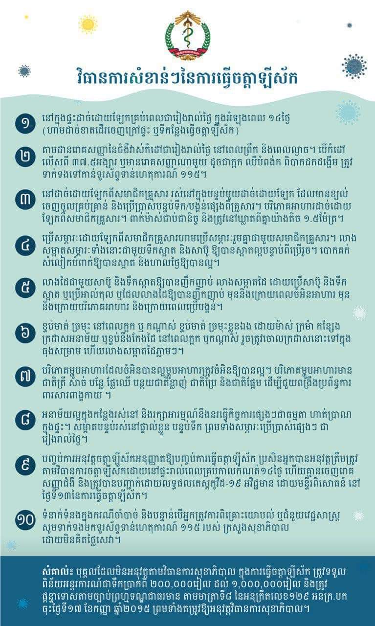 ត្រូវគោរពវិធានចត្តាឡីស័កនៅតាមផ្ទះ ឫមណ្ឌលចត្តាឡីស័ក បេីមិនដូច្នោះទេ អ្នកនឹងទទួលការផាកពិន័យ ២សែនរៀលដល់១លានរៀល ព្រមទាំងទទួលទោសព្រហ្មទណ្ឌជាធរមាន ។ពត៌មានបន្ថែមសូមទាក់ទងលេខ ១១៥
