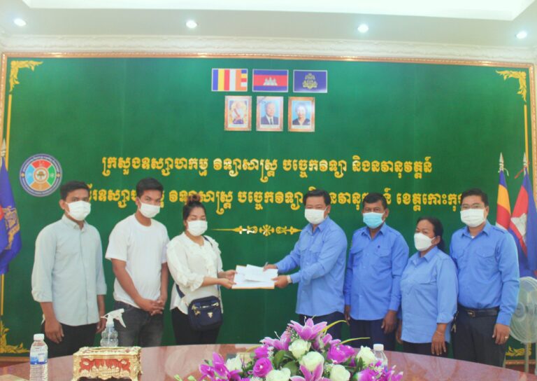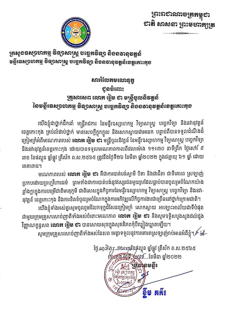 លោកប្រធានមន្ទីរឧស្សាហកម្ម វិទ្យាសាស្ត្រ បច្ចេកវិទ្យា និងនវានុវត្តន៍ខេត្តកោះកុង បាននាំយកថវិការចំនួន ៥,៥៦០,០០០ រៀល ជូនដល់គ្រួសារសព លោក រៀម ជា មន្រ្តីចូលនិវត្តន៍ នៃមន្ទីរឧវបន ខេត្តកោះកុង ដែលបានទទួលមរណភាព។