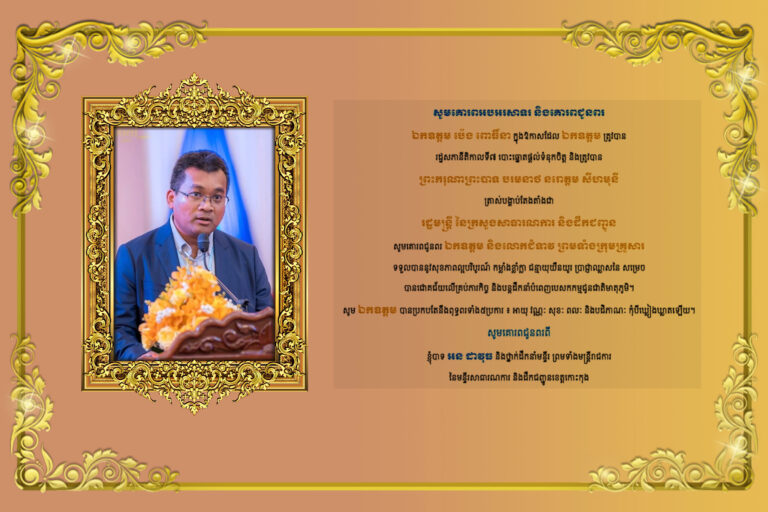 យើងខ្ញុំជាថ្នាក់ដឹកនាំ និងមន្រ្តីរាជការទាំងអស់ នៃមន្ទីរសាធារណការ និងដឹកជញ្ជូនខេត្តកោះកុង សូមគោរពអបអរសាទរ ឯកឧត្តម ប៉េង ពោធិ៍នា ត្រូវបាន ព្រះករុណា ព្រះបាទបរមនាថ នរោត្តម សីហមុនី ត្រាស់បង្គាប់តែងតាំងជា រដ្ឋមន្រ្តី ក្រសួងសាធារណការ និងដឹកជញ្ជូន