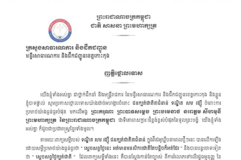 ញត្តិថ្កោលទោស យើងខ្ញុំទាំងអស់គ្នា ជាថ្នាក់ដឹកនាំ និងមន្ត្រីរាជការ នៃមន្ទីរសាធារណការ និងដឹកជញ្ជូនខេត្តកោះកុង សូមប្រកាសគោលជំហរប្រឆាំងដាច់ខាត និងថ្កោលទោសយ៉ាងដាច់អហង្ការ ចំពោះគំនិត អសីលធម៌ ក៏ដូចជារាល់សកម្មភាពរបស់ទណ្ឌិតជនក្បត់ជាតិ សម រង្ស៊ី