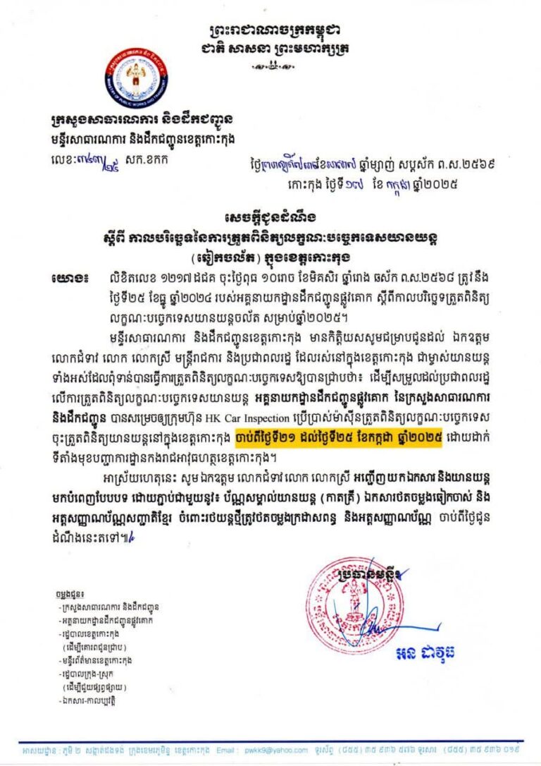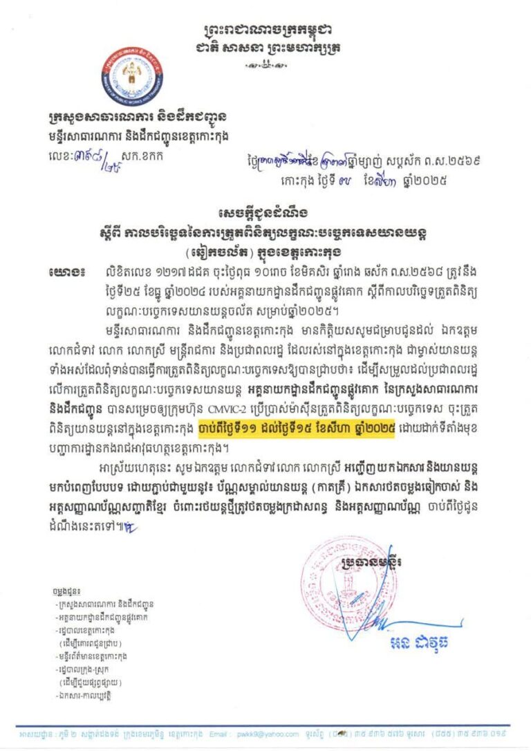 សេចក្តីជូនដំណឹងស្តីពីការត្រួតពិនិត្យលក្ខណៈបច្ចេកទេសយានយន្ត (ឆៀក)ចល័ត