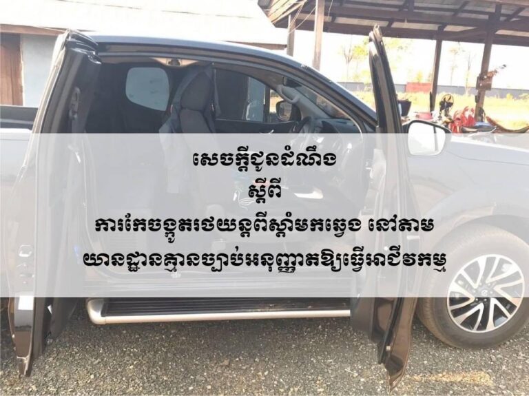 សេចក្តីជូនដំណឹង ស្តីពីការកែចង្កូតរថយន្តពីស្តាំមកឆ្វេង នៅតាមយានដ្ឋានគ្មានច្បាប់អនុញ្ញាតឲ្យធ្វើអាជីវកម្ម