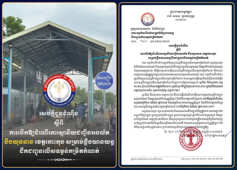 សេចក្តីជូនដំណឹង ស្តីពីការបើកឱ្យដំណើរការស្ថានីយជញ្ជីងអចល័ត បឹងឃុនឆាង ខេត្តកោះកុង សម្រាប់ថ្លឹងយានយន្តដឹកជញ្ជូនលើសទម្ងន់កម្រិតកំណត់