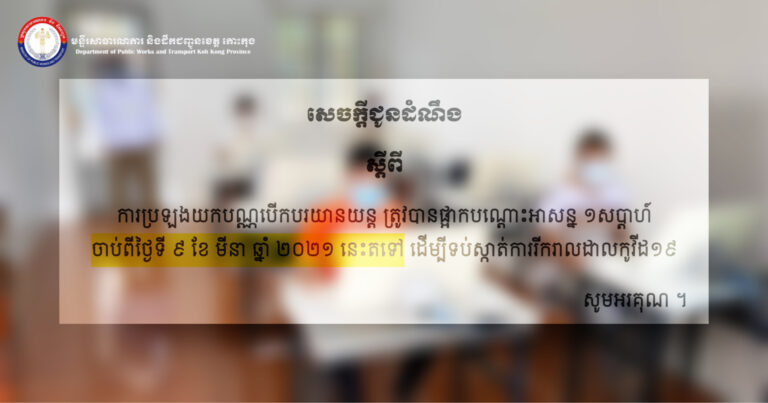 សេចក្តីជូនដំណឹង………….ស្តីពីការបញ្ឈប់ការផ្តល់សេវាក្នុងវិស័យដឹកជញ្ជូនផ្លូវគោក នៅមន្ទីរសាធារណការ និងដឹកជញ្ជូនខេត្តកោះកុង។សូមអរគុណ!