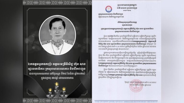លិខិតសូមចូលរួមរំលែកទុក្ខសូមគោរពជូនក្រុមគ្រួសារឯកឧត្តមអ្នកឧកញ៉ា ឧត្តមមេត្រីវិសិដ្ឋ ហ៊ុន សាន រដ្ឋលេខាធិការ ក្រសួងសាធារណការ និងដឹកជញ្ជូន