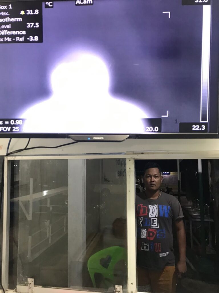 ក្រុមការងារចត្តាឡីស័ក នៃមន្ទីរសុខាភិបាលខេត្តកោះកុង បានធ្វើការត្រួតពិនិត្យកំដៅអ្នកបើកបរដឹកទំនិញចេញ-ចូលតាមច្រកព្រំដែនអន្តរជាតិចាំយាម ព្រមជាមួយនឹងការបាញ់ថ្នាំសំលាប់មេរោគទៅលើរថយន្តដឹកទំនិញផងដែរ។