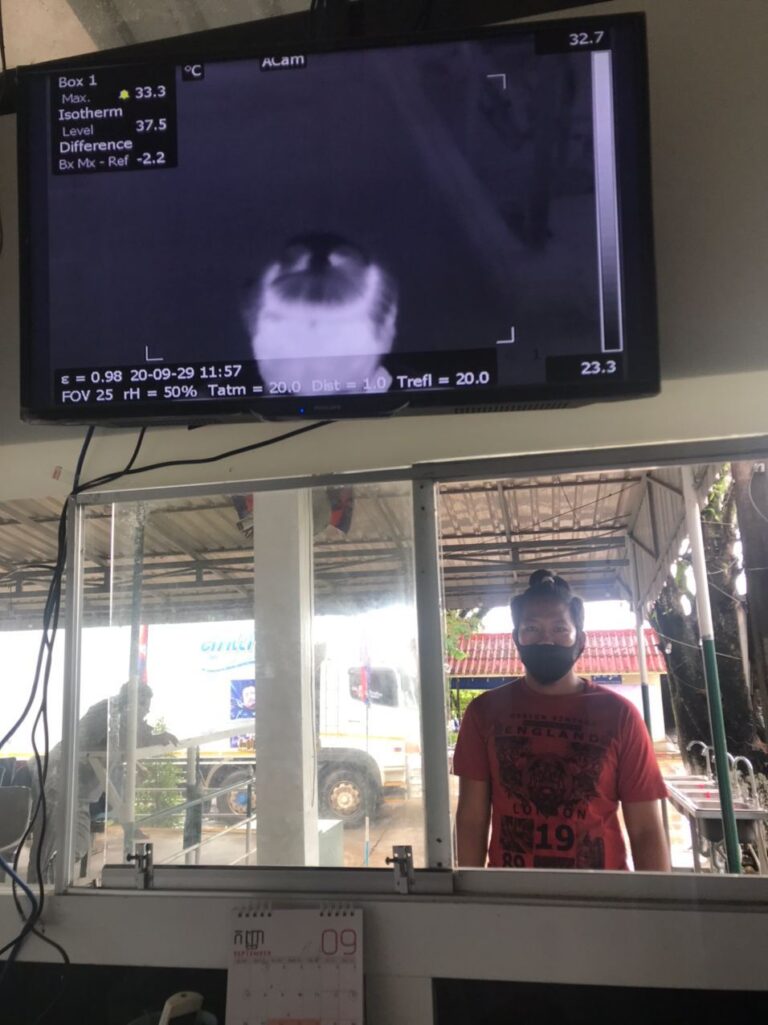 ក្រុមការងារចត្តាឡីស័ក នៃមន្ទីរសុខាភិបាលខេត្តកោះកុង បានធ្វើការត្រួតពិនិត្យកំដៅអ្នកបើកបរដឹកទំនិញចេញ-ចូលតាមច្រកព្រំដែនអន្តរជាតិចាំយាម ព្រមជាមួយនឹងការបាញ់ថ្នាំសំលាប់មេរោគទៅលើរថយន្តដឹកទំនិញផងដែរ។