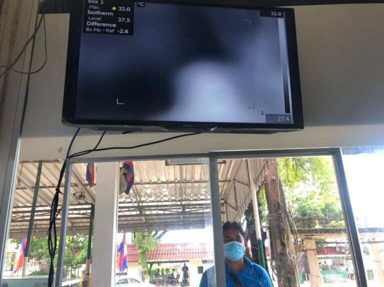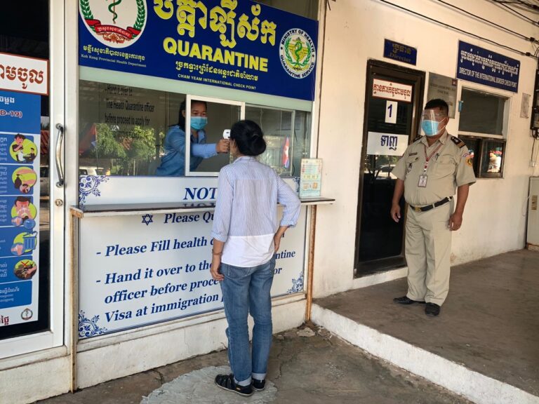 ក្រុមការងារចត្តាឡីស័ក នៃមន្ទីរសុខាភិបាលខេត្តកោះកុង បានធ្វើការត្រួតពិនិត្យកំដៅអ្នកបើកបរដឹកទំនិញចេញ-ចូលតាមច្រកព្រំដែនអន្តរជាតិចាំយាម ព្រមជាមួយនឹងការបាញ់ថ្នាំសំលាប់មេរោគទៅលើរថយន្តដឹកទំនិញផងដែរ។