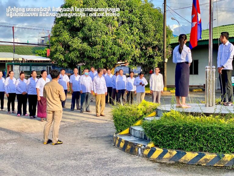 សកម្មភាពគោរពទង់ជាតិ និងភ្លេងជាតិ នៃព្រះរាជាណាចក្រកម្ពុជា ដោយយកចិត្តទុកដាក់ជាប្រចាំពីមន្ទីរសាធារណការ និងដឹកជញ្ជូនខេត្តកោះកុង នៅព្រឹកថ្ងៃចន្ទ ៥ រោច ខែភទ្របទ ឆ្នាំជូត ទោស័ក ពុទ្ធសករាជ ២៥៦៤ ត្រូវនឹងថ្ងៃទី៧ ខែកញ្ញា ឆ្នាំ២០២០