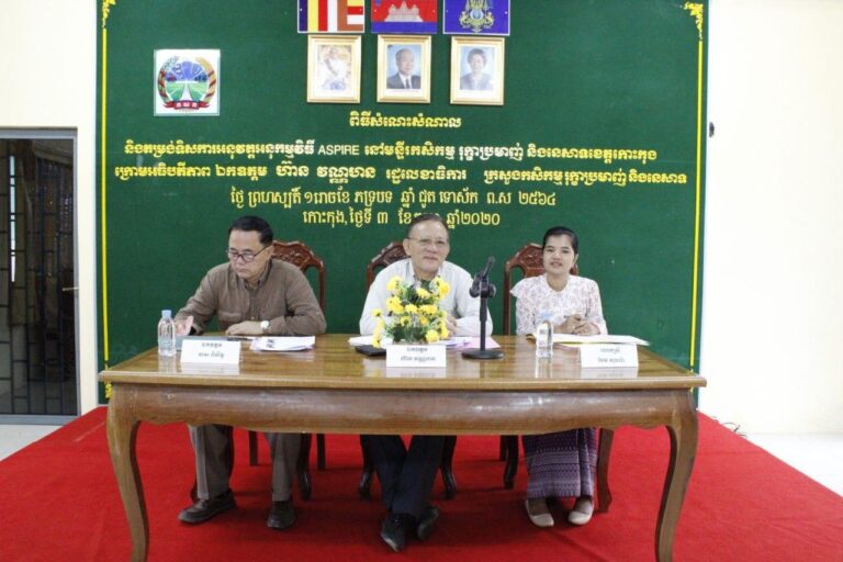 កិច្ចប្រជុំត្រួតពិនិត្យវឌ្ឍនភាព និងតម្រង់ទិសការអនុវត្ដអនុកម្មវិធី ASPIRE ប្រចាំខេត្ដកោះកុង ក្រោមអធិបតីភាព ឯកឧត្ដម ហ៊ាន វណ្ណហន រដ្ឋលេខាធិការក្រសួងកសិកម្ម រុក្ខាប្រមាញ់ និងនេសាទ និងឯកឧត្តម មាស ពិសិដ្ឋ អនុរដ្ឋលេខាធិការក្រសួងកសិកម្ម រុក្ខាប្រមាញ់ និងនេសាទ និងជានាយកកម្មវិធី ASPIRE ដោយមានការអញ្ជើញចូលរួមពី លោកស្រី អែម សុធារ៉ា អនុប្រធានមន្ទីរ លោក លោកស្រី និងមន្រ្តីរាជការ ដែលជាសមាជិកកម្មវិធី ASPIRE