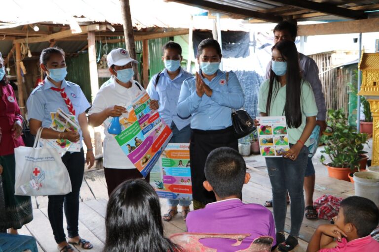ដោយមានការយកចិត្តទុកដាក់ខ្ពស់ពីសុខភាពបងប្អូនប្រជាពលរដ្ឋ នៅតាមសហគមន៍ លោកជំទាវ មិថុនា ភូថង ប្រធានគណៈកម្មាធិការសាខា បានចាត់អោយក្រុមប្រតិបត្តិសាខា ទទួលបន្ទុកសុខភាព សហការជាមួយ លោកស្រី ស៊ិន ចរិយា អនុប្រធានគណៈកម្មាធិការ អនុសាខាកាកបាទក្រហមកម្ពុជា ក្រុងខេមរភូមិន្ទ និងក្រុមការងារ អាជ្ញាធរសង្កាត់ស្មាច់មានជ័យ សង្កាត់ដងទង់ អ្នកស្ម័គ្រចិត្តភូមិ បានដឹកនាំ យុវជនកាកបាទក្រហម យុវជនសសយក យុវជនក១២ បន្តចុះអប់រំផ្សព្វផ្សាយអំពីវិធានការទប់ស្កាត់ និងការការពារការរាតត្បាតជំងឺកូវីដ ១៩ បង្រៀនពីរបៀបលាងដៃអោយត្រឹមត្រូវ និងផ្សព្វផ្សាយសារអប់រំរបស់ក្រសួងសុខាភិបាលដោយប្រើប្រាស់មេក្រូ បិទផុស្ទ័រ ពីវិធីកាត់បន្ថយហានិភ័យពីការឆ្លងជំងឺកូវីដ១៩ នៅ ក្នុងសង្កាត់ស្មាច់មានជ័យ សង្កាត់ដងទង់ ក្រុងខេមរភូមិន្ទ