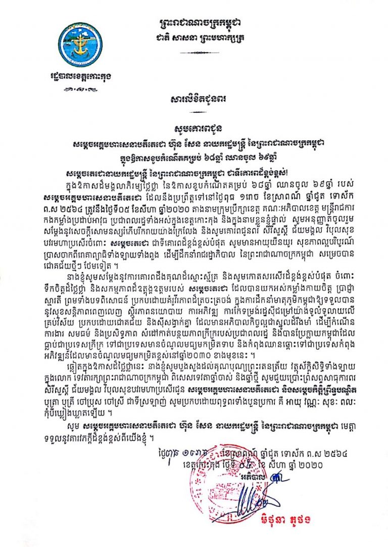 សារលិខិតជូនពរ សម្តេចអគ្គមហាសេនាបតីតេជោ ហ៊ុន សែន នាយករដ្ឋមន្ត្រី នៃព្រះរាជាណាចក្រកម្ពុជា នាឱកាសដ៏មហាជ័យមង្គលចម្រើនជន្មាយុគម្រប់ ៦៨ ឈានចូល ៦៩ឆ្នាំ។