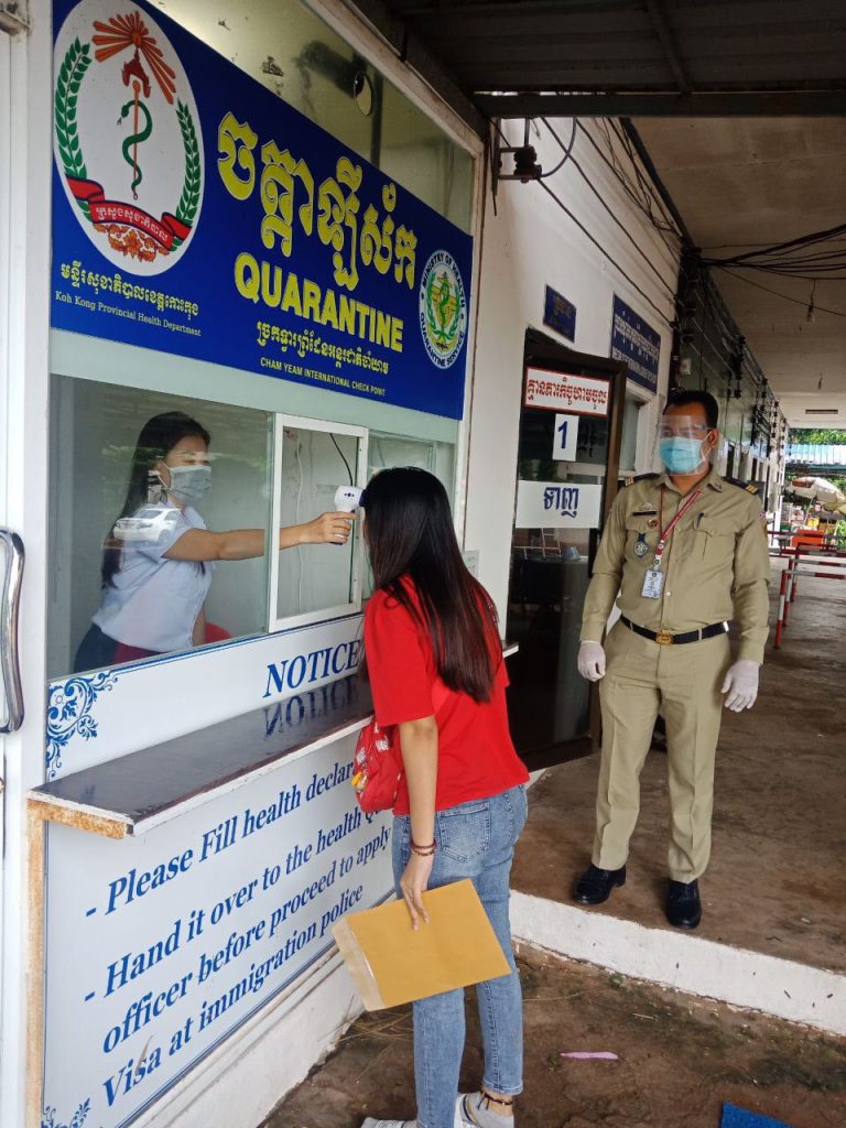 ក្រុមការងារចត្តាឡីស័ក នៃមន្ទីរសុខាភិបាលខេត្តកោះកុង បានធ្វើការត្រួតពិនិត្យកំដៅអ្នកបើកបរដឹកទំនិញចេញ-ចូលតាមច្រកព្រំដែនអន្តរជាតិចាំយាម ព្រមជាមួយនឹងការបាញ់ថ្នាំសំលាប់មេរោគទៅលើរថយន្តដឹកទំនិញផងដែរ។