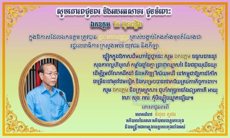 លោកជំទាវ មិថុនា ភូថង អភិបាល នៃគណៈអភិបាលខេត្តកោះកុង និងមន្ត្រីរាជការក្នុងខេត្តកោះកុងទាំងអស់ អបអរសាទរ ជូនចំពោះ ឯកឧត្តម កែ ប៊ុនខៀង ក្នុងឱកាសដែលឯកឧត្តម ត្រូវបាន ព្រះមហាក្ស ត្រាស់បង្គាប់តែងតាំងមុខតំណែងជារដ្ឋលេខាធិការ ក្រសួងអប់រំ យុវជន និងកីឡា។