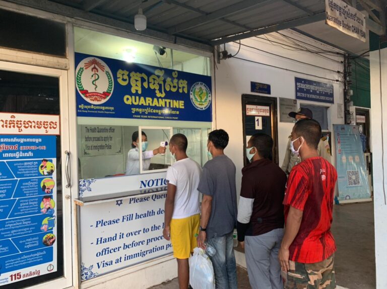 ក្រុមការងារចត្តាឡីស័ក នៃមន្ទីរសុខាភិបាលខេត្តកោះកុង បានធ្វើការត្រួតពិនិត្យកំដៅអ្នកបើកបរដឹកទំនិញចេញ-ចូលតាមច្រកព្រំដែនអន្តរជាតិចាំយាម ព្រមជាមួយនឹងការបាញ់ថ្នាំសំលាប់មេរោគទៅលើរថយន្តដឹកទំនិញផងដែរ។