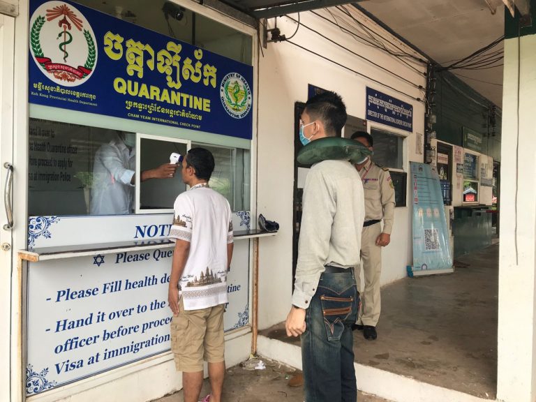 ក្រុមការងារចត្តាឡីស័ក នៃមន្ទីរសុខាភិបាលខេត្តកោះកុង បានធ្វើការត្រួតពិនិត្យកំដៅអ្នកបើកបរដឹកទំនិញចេញ-ចូលតាមច្រកព្រំដែនអន្តរជាតិចាំយាម ព្រមជាមួយនឹងការបាញ់ថ្នាំសំលាប់មេរោគទៅលើរថយន្តដឹកទំនិញផងដែរ។