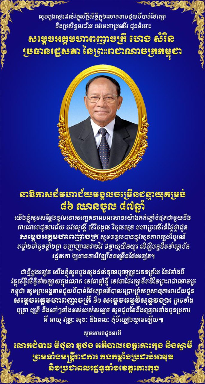 លោកជំទាវ មិថុនា ភូថង អភិបាល នៃគណៈអភិបាលខេត្តកោះកុង ផ្ញើសារលិខិតគោរពជូនពរ សម្តេច ហេង សំរិន ក្នុងឱកាសបុណ្យចម្រើនជន្មាយុគម្រប់ ៨៦ ឆ្នាំ ឈានចូល ៨៧ ឆ្នាំ