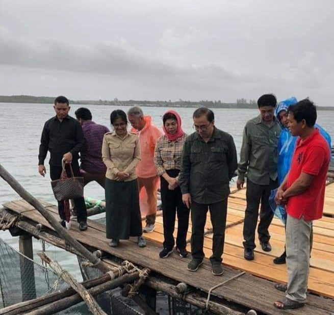 លោកជំទាវ មិថុនា ភូថង អភិបាល នៃគណៈអភិបាលខេត្តកោះកុង អញ្ជើញអមដំណើរ ឯកឧត្តម វេង សាខុន រដ្ឋមន្ត្រីក្រសួងកសិកម្ម រុក្ខាប្រមាញ់ និងនេសាទ ឯកឧត្តម អេង ជាសាន ប្រតិភូរាជរដ្ឋាភិបាលកម្ពុជាទទួលបន្ទុកជាប្រធានរដ្ឋបាលជលផល ចុះមកពិនិត្យសកម្មភាពចិញ្ចឹមត្រីឆ្ពង់ក្នុងបែ របស់លោក សេង ចន្ថា នៅភូមិ៣ ឃុំប៉ាក់ខ្លង ស្រុកមណ្ឌលសីមា។