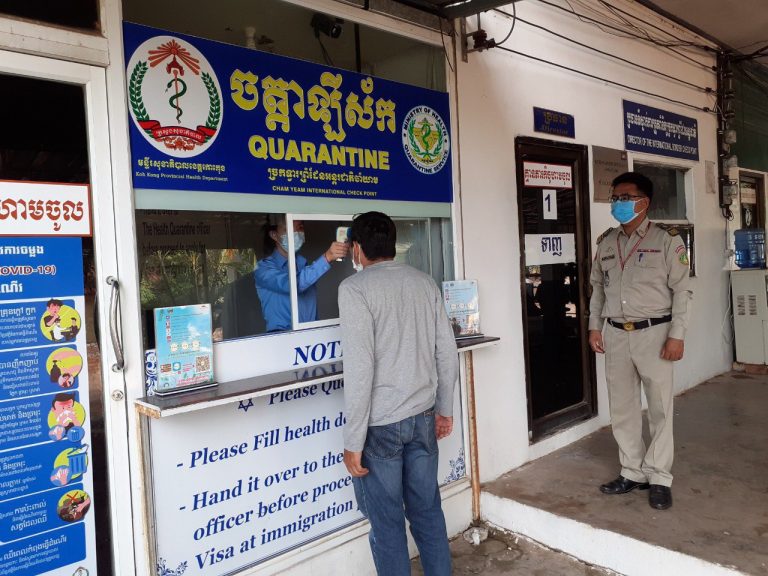ក្រុមការងារចត្តាឡីស័ក នៃមន្ទីរសុខាភិបាលខេត្តកោះកុង បានធ្វើការត្រួតពិនិត្យកំដៅអ្នកបើកបរដឹកទំនិញចេញ-ចូលតាមច្រកព្រំដែនអន្តរជាតិចាំយាម ព្រមជាមួយនឹងការបាញ់ថ្នាំសំលាប់មេរោគទៅលើរថយន្តដឹកទំនិញផងដែរ