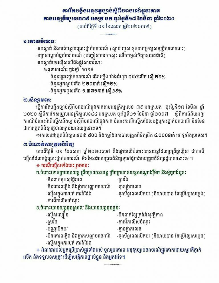 ការរឹតបន្តឹងអនុវត្តច្បាប់ និងចំនួនទឹកប្រាក់ផាកពិន័យ ស្តីពីចរាចរណ៍ផ្លូវគោក តាមអនុក្រឹត្យលេខ ៣៩ អនក្រ.បក ចុះថ្ងៃទី១៧ ខែមីនា ឆ្នាំ២០២០