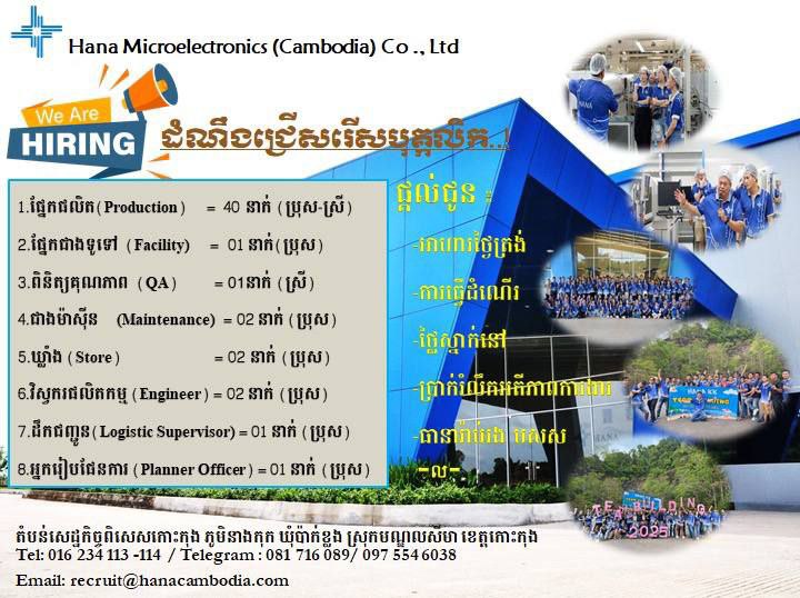 ក្រុមហ៊ុន ហាណាម៉ាយក្រូអេឡិកត្រូនិក(ខេមបូឌា) Hana Microelectronics (Cambodia) Co.,Ltd ត្រូវការជ្រើសរើសបុគ្គលិកបន្ទាន់ ផ្នែកផលិតកម្ម(Production) ចំនួន ៤០នាក់ Tel : 081716089 Telegram : 081 706 089