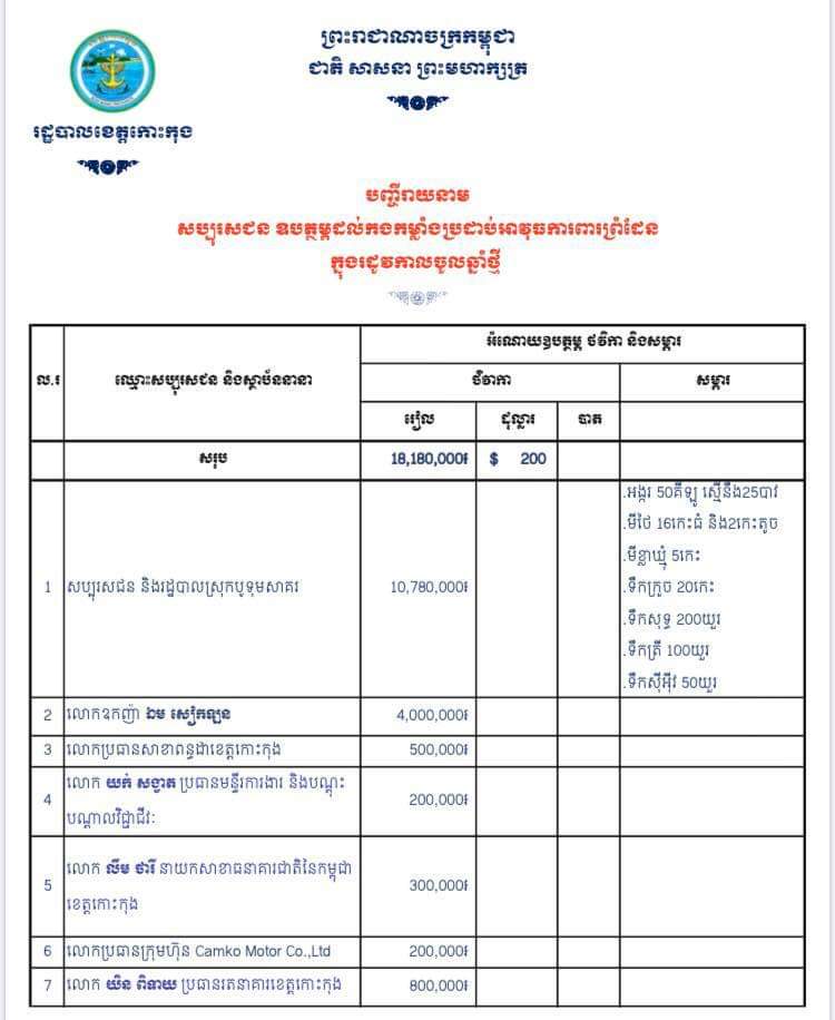 លោក យី កំសាន្ត អនុប្រធានការិយាល័យគាំទ្រមូលដ្ឋាន សាលាខេត្តកោះកុង សូមស្ម័គ្រចិត្តចូលរួមជាថវិកា ជូនដល់គណៈកម្មាធិការជាតិប្រយុទ្ធប្រឆាំងជំងឺកូវីដ-១៩