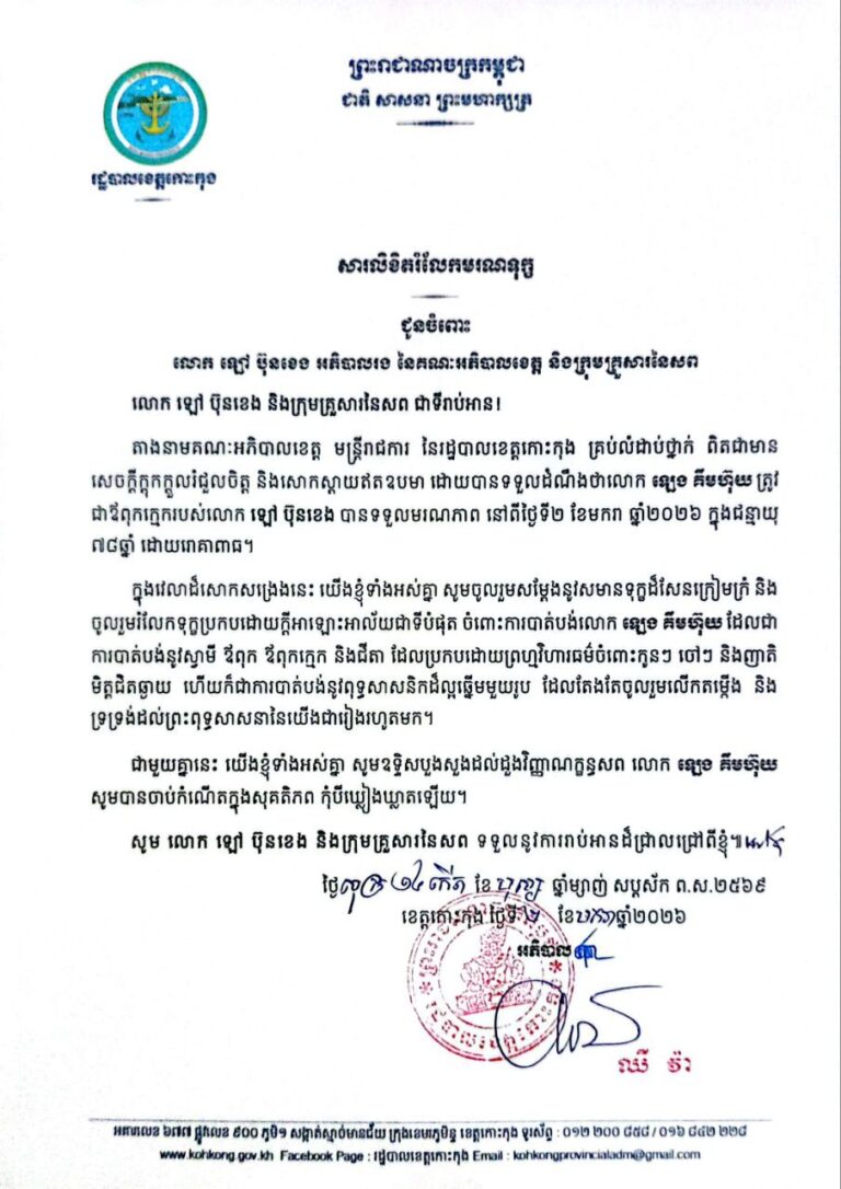 លោកជំទាវ ឈី វ៉ា អភិបាល នៃគណៈអភិបាលខេត្តកោះកុង បានអញ្ជើញគោរពវិញ្ញាណក្ខន្ធសព លោក ឡេង គឹមហ៊ុយ ដែលបានទទួលមរណៈភាពក្នុងជន្មាយុ ៧៧ឆ្នាំ ដោយរោគាពាធិ៍ ត្រូវជាឪពុកក្មេករបស់លោក ឡៅ ប៊ុនខេង អភិបាលរង នៃគណៈអភិបាលខេត្តកោះកុង ស្ថិតនៅភូមិ២ សង្កាត់ស្មាច់មានជ័យ ក្រុងខេមរភូមិន្ទ ខេត្តកោះកុង