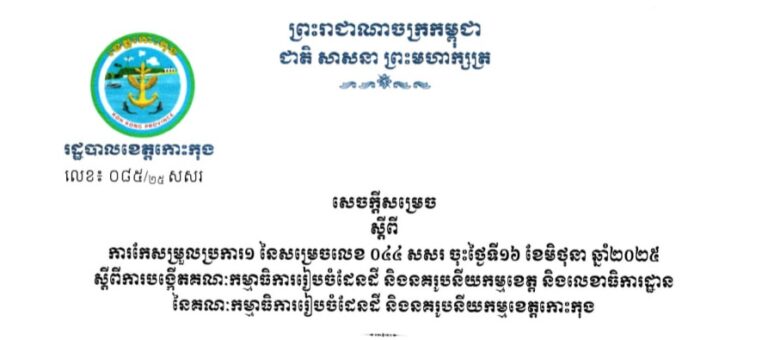 សេចក្ដីសម្រេចលេខ ០៨៥ ស្ដីពីការកែសម្រួលប្រការ១ នៃគណៈកម្មាធិការរៀបចំដែនដី និងនគរូបនីយកម្មខេត្ត និងលេខាធិការដ្ឋាន នៃគណៈកម្មាធិការរៀបចំដែនដី និងនគរូបនីយកម្មខេត្តកោះកុង