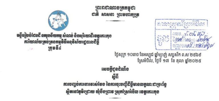 សេចក្តីជូនដំណឹង ស្តីពីការបញ្ចប់ការងារវាស់វែង នៃការចុះបញ្ជីដីធ្លីមានលក្ខណៈជាប្រព័ន្ធ ស្ថិតនៅភូមិជ្រោយ ឃុំបឹងព្រាវ ស្រុកស្រែអំបិល ខេត្តកោះកុង