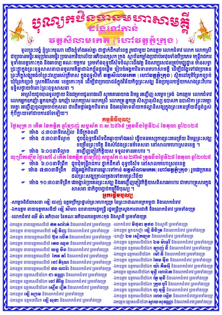 សូមគោរពយាង និមន្ត អញ្ជើញ សម្តេច ទ្រង់ ឯកឧត្តម លោកជំទាវ លោកអ្នកឧកញ៉ា អ្នកឧកញ៉ា ឧកញ៉ា លោកប្រុស លោកស្រី លោកគ្រូ អ្នកគ្រូ សិស្សានុសិស្ស ឧបាសក ឧបាសិកា ព្រះមេត្តា មេត្តាអញ្ជើញចូលរួម ពីធីអង្គកឋិនទានមហាសាមគ្គី ដើម្បីដង្ហែទៅវេរប្រគេនព្រះភិក្ខុសង្ឃគង់ចាំព្រះវស្សាអស់ត្រីមាស ក្នុងពុទ្ធសីមា វត្តសិលាមរកត(ហៅវត្តភ្នំក្រុង) ស្ថិតនៅភូមិព្រែកខ្សាច់ ឃុំព្រែកខ្សាច់ ស្រុកគិរីសាគរ ខេត្តកោះកុង និងចាប់មគ្គផលតាមកម្លាំងសទ្ធា ហើយអនុមោទនាយកផល្លានិសង្សក្នុងព្រះរតនត្រ័យរៀងខ្លួន។ សូមអនុមោទនា !