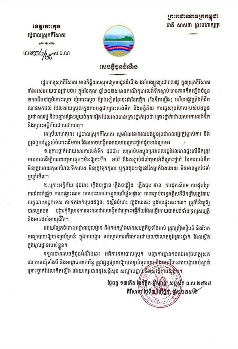លោក ចេង មុនីរិទ្ធ អភិបាល នៃគណៈអភិបាលស្រុកគិរីសាគរ លោក ជា ប៊ុនធឿន អភិបាលរងស្រុកគិរីសាគរ បានចូលរួមកិច្ចប្រជុំផ្សព្វផ្សាយដំណាក់កាលទី២ អំពីការគ្រប់គ្រងវត្តមានជនបរទេស ក្នុងព្រះរាជាណាចក្រកម្ពុជាតាមរយៈប្រព័ន្ធគ្រប់គ្រង FPCS ជាមួយសមត្ថកិច្ចពាក់ព័ន្ធ និងវិស័យ ឯកជន