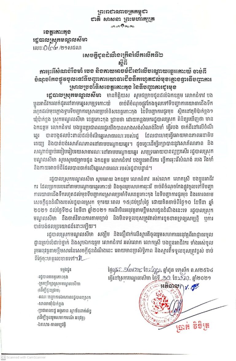 រដ្ឋបាលស្រុកមណ្ឌលសីមា សូមជូនដំណឹងក្រើនរំលឹកលើកទី២ ស្ដីពីការរុះរើសំណង់រឹងមាំ របង និងកាយអាចម៍ដីនៅលើបណ្ដោយឆ្នេរកោះយ៉
