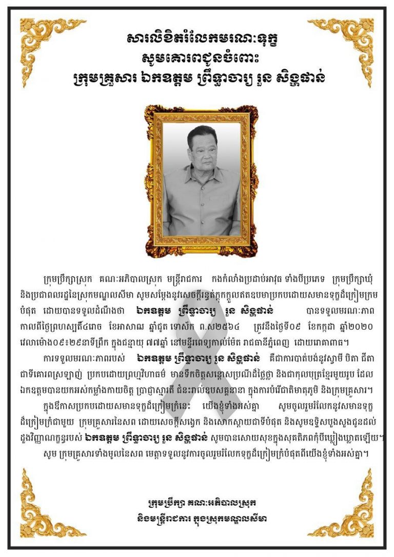 ថ្នាក់ដឹកនាំ មន្ត្រីរាជការ កម្លាំងប្រដាប់អាវុធ និងប្រជាពលរដ្ឋស្រុកមណ្ឌលសីមានៃខេត្តកោះកុង សូមចូលរួមរំលែកមរណទុក្ខ ជូនក្រុមគ្រួសារ នៃសព ឯកឧត្តម ព្រឹទ្ធាចារ្យ រួន សិង្ហផាន់ អនុប្រធានគណៈកម្មាធិការគណបក្សប្រជាជនកម្ពុជាខេត្តកោះកុង ។