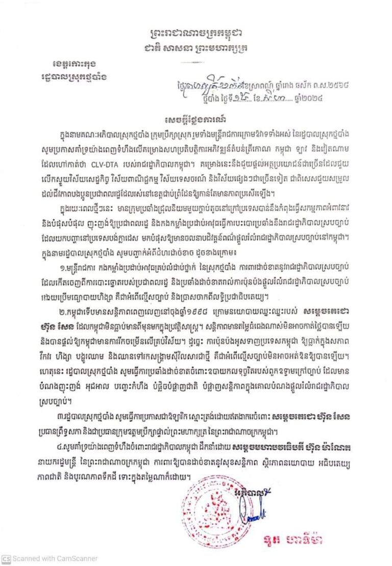 សេចក្តីថ្លែងការណ៍របស់រដ្ឋបាលស្រុកថ្មបាំង គាំទ្រកិច្ចសហប្រតិបត្តិការតំបន់ត្រីកោណអភិវឌ្ឍន៍ (CLV-DTA)