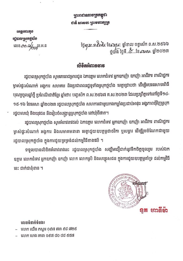 លិខិតអំពាវនាវអបអរសាទរពិធីបុណ្យចូលឆ្នាំថ្មីប្រពៃណីជាតិខ្មែរ របស់រដ្ឋបាលស្រុកថ្មបាំង